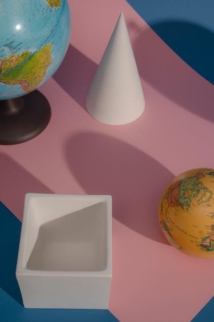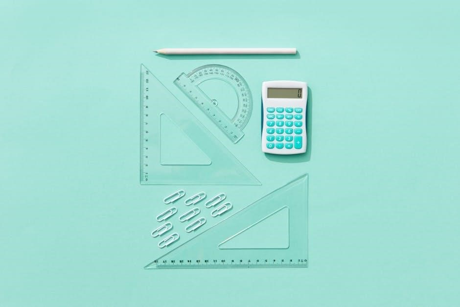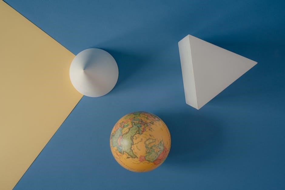 Measuring angles is another key concept‚ with types including acute‚ right‚ obtuse‚ and straight angles. These classifications help in understanding triangles and polygons. Additionally‚ concepts like perimeter (distance around a shape)‚ area (space inside a shape)‚ and volume (space occupied by a three-dimensional object) are essential for practical applications.